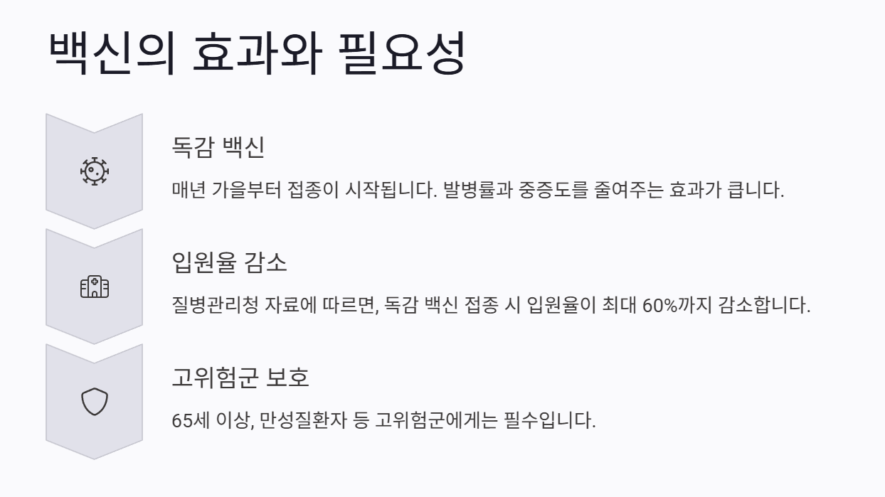 📊 질병관리청 자료에 따르면, 독감 백신 접종 시 입원율이 최대 60%까지 감소한다고 해요.