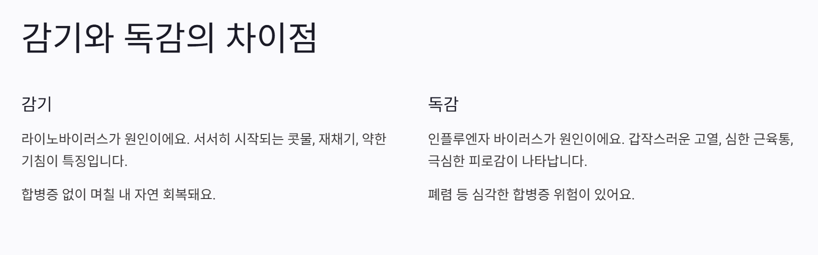 - 독감: 고열, 오한, 극심한 피로, 두통