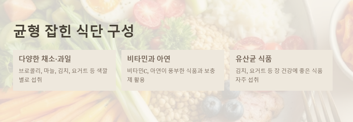 비타민C가 풍부한 과일(귤, 오렌지), 브로콜리, 마늘, 김치, 요구르트 등이 좋아요. 균형 있는 식단이 핵심입니다.