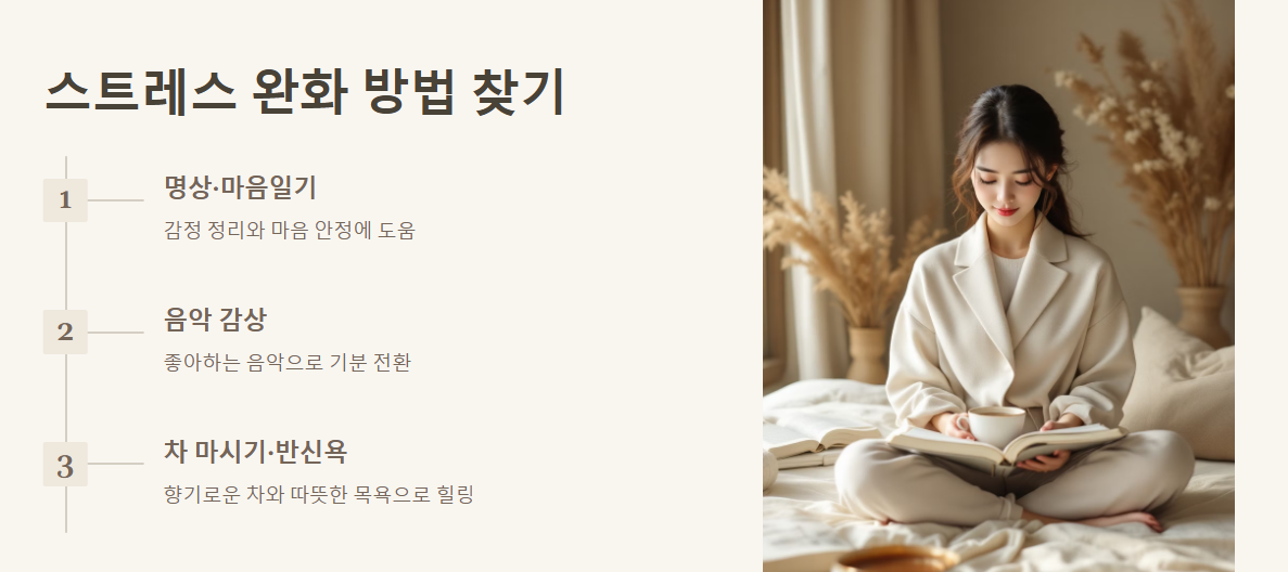 스트레스를 받으면 몸이 염증 반응을 일으키고 면역 기능도 떨어진다고 해요. 그래서 저는 최근 명상과 마음일기를 시작했어요. 일기장에 하루의 감정을 쓰는 것만으로도 마음이 정리되더라고요. 또 좋아하는 음악 듣기, 반신욕, 향기 좋은 차 마시기 등 저만의 힐링 루틴을 만들고 있어요. 여러분도 자신만의 방법을 꼭 찾아보세요!