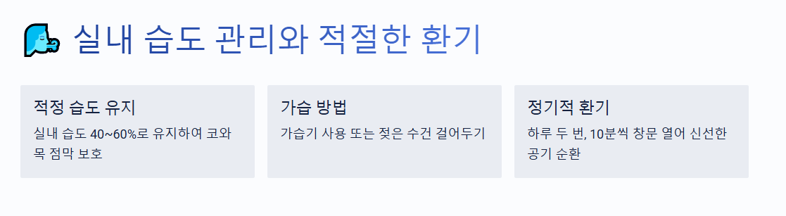 건조한 실내 공기는 코와 목 점막을 약하게 만들어 바이러스 감염에 취약해져요. 따라서 실내 습도는 40~60%로 유지하는 것이 좋아요. 가습기를 사용하거나, 젖은 수건을 걸어두는 것도 좋은 방법이에요. 또, 겨울이라고 환기를 게을리하면 오히려 감기균이 실내에 머무르게 되죠. 하루 두 번, 10분씩 창문을 열어 신선한 공기를 순환시켜 주세요! 습도와 환기 관리만 잘해도 감기 예방에 훨씬 유리해요 ✅