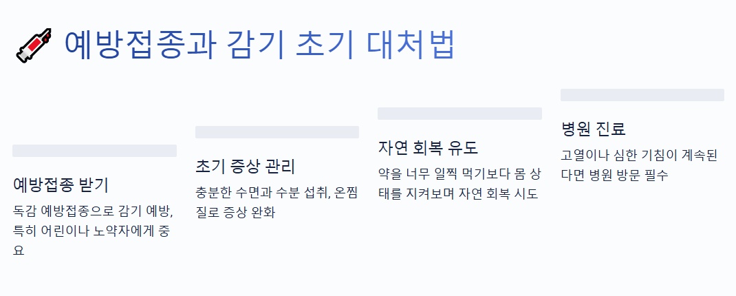 독감 예방접종은 감기 예방에 있어서 가장 확실한 방법 중 하나예요. 특히 어린이나 노약자라면 꼭 맞아야 하죠. 감기 초기엔 충분한 수면과 수분 섭취, 온찜질로 증상을 완화해 주세요. 약을 너무 일찍 먹는 것보다는 몸 상태를 지켜보며 자연 회복을 유도하는 것도 방법이에요. 다만 고열이나 심한 기침이 계속된다면 병원 진료는 필수! 조기 대응이 가장 큰 치료입니다.