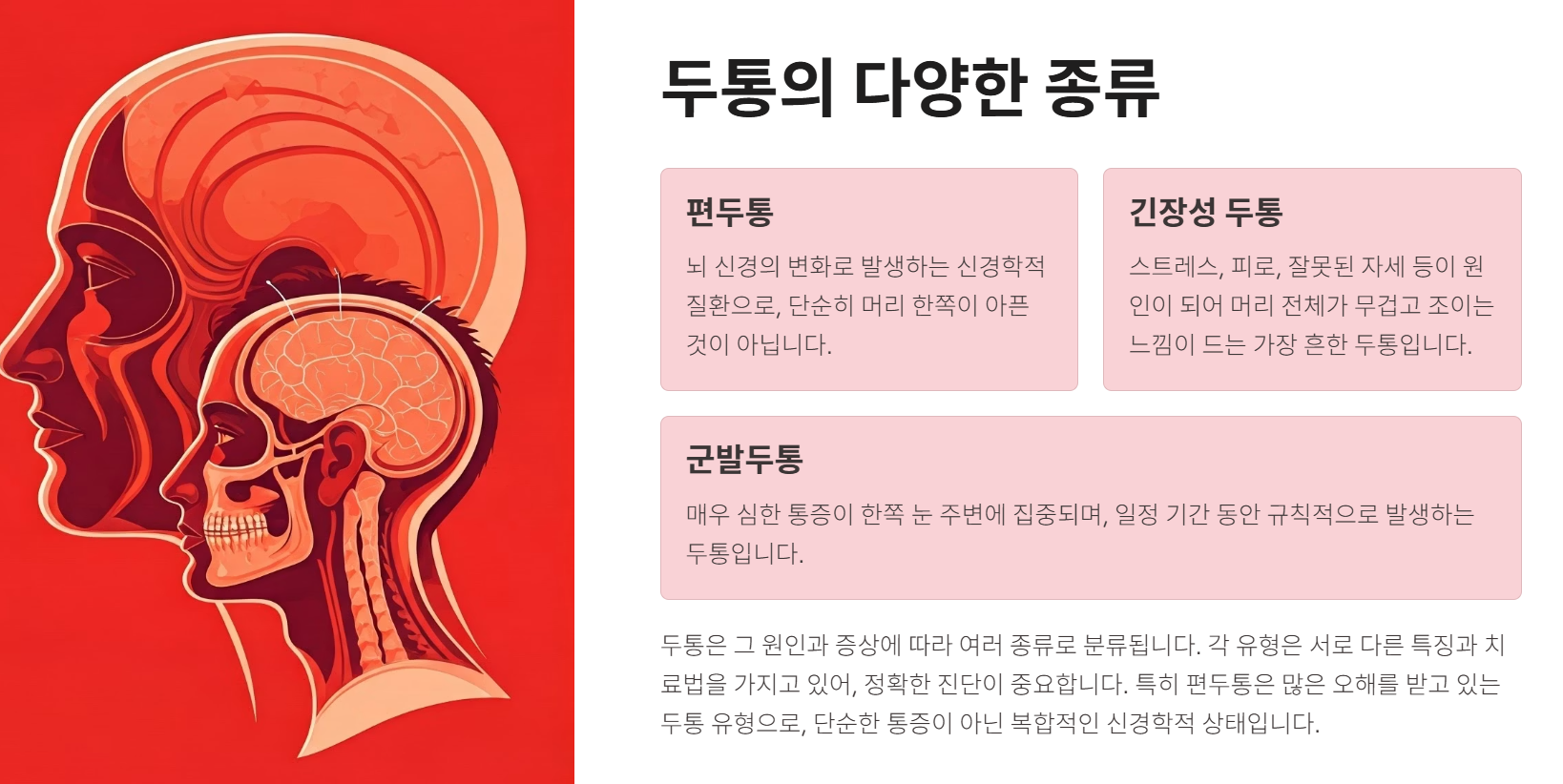 두통이라고 다 같은 두통이 아닙니다. 머리가 아프면 그냥 진통제 하나 먹고 넘기는 경우가 많지만, 실제로는 '편두통', '긴장성 두통', '군발두통' 등 다양한 형태가 있어요. 그중 가장 많은 오해를 받는 게 바로 '편두통'인데요, 단순히 머리 한쪽이 아픈 게 아니라 뇌 신경의 변화로 발생하는 신경학적 질환이에요. 그래서 일반적인 두통과는 원인도 다르고 치료법도 다릅니다. 정확히 구분해서 대처해야 만성화되는 걸 막을 수 있어요.