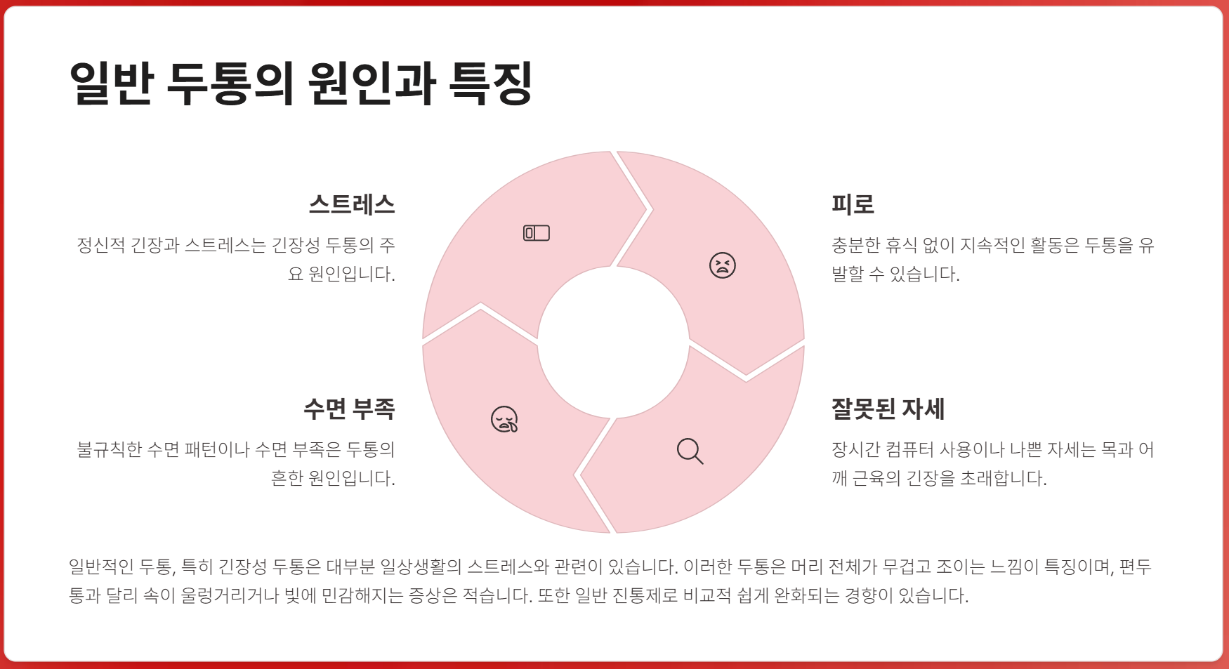 일반적으로 우리가 말하는 두통은 대부분 '긴장성 두통'입니다. 😵💫 이는 스트레스, 피로, 잘못된 자세 등이 원인이 되어 머리 전체가 무겁고 조이는 느낌이 들죠. 하루 종일 컴퓨터 앞에서 일하거나 잠을 제대로 못 잤을 때 자주 겪는 바로 그 두통이에요. 편두통과 달리 속이 울렁거리거나 빛에 민감해지진 않으며, 진통제로 비교적 쉽게 완화됩니다. 또 자극적인 냄새나 소음에도 영향을 받지 않는 경우가 많아요.