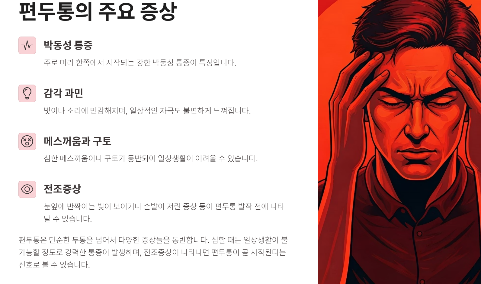 편두통은 단순한 두통을 넘어서 다양한 증상들을 동반합니다. 💥 주로 머리 한쪽에서 시작되는 강한 박동성 통증과 함께 빛이나 소리에 민감해지고, 메스꺼움이나 구토가 동반되기도 해요. 심할 땐 일상생활이 힘들 정도로 누워있어야 할 만큼 강력한 통증이 오죠. 그리고 '전조증상'이라는 것도 있는데, 눈앞에 반짝이는 빛이 보이거나 손발이 저린 증상 등이 발생합니다. 이런 전조가 나타나면 편두통이 곧 시작된다는 신호이기도 해요.