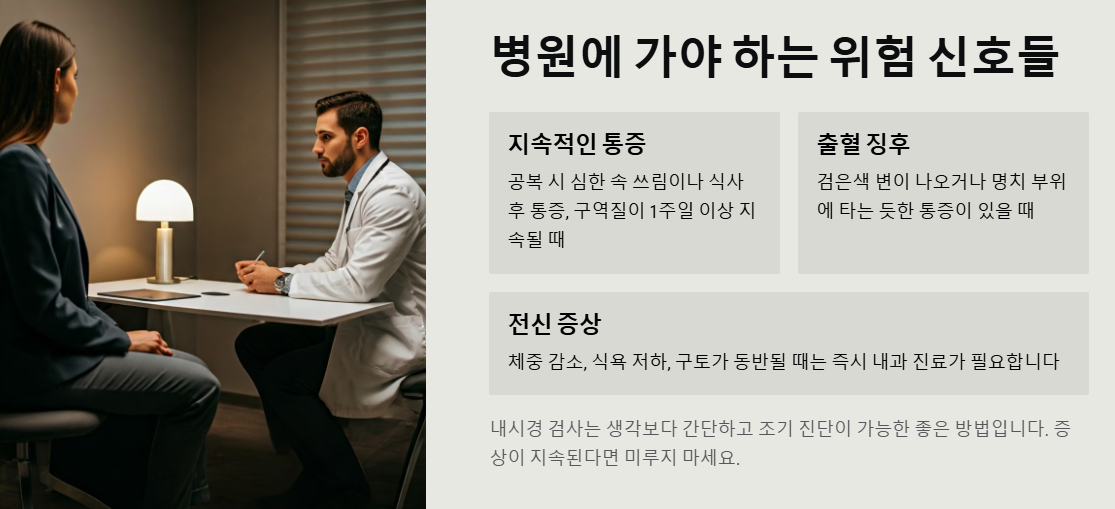 특히 속 쓰림과 함께 구토나 식욕 저하가 동반된다면 즉시 내과 진료를 받으셔야 해요. 내시경 검사는 생각보다 간단하고, 조기 진단이 가능한 좋은 방법이니까요!