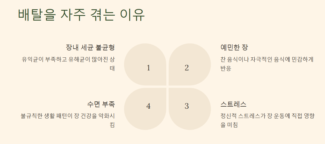 배탈이 자주 난다는 건 장이 예민하거나, 장내 세균 균형이 깨졌다는 뜻이에요. 저는 특히 찬 음식만 먹으면 바로 복통이 오곤 했는데, 알고 보니 유익균이 부족해서 그렇다고 하더라고요. 또 스트레스나 수면 부족도 큰 원인입니다. 장은 우리 기분과도 연결돼 있어서 불안할 때 더 민감해지죠. 배탈이 자주 나면 위나 장의 염증을 의심해볼 수도 있어요. 한두 번으로 끝나지 않는다면 진료를 받아보는 게 좋아요.