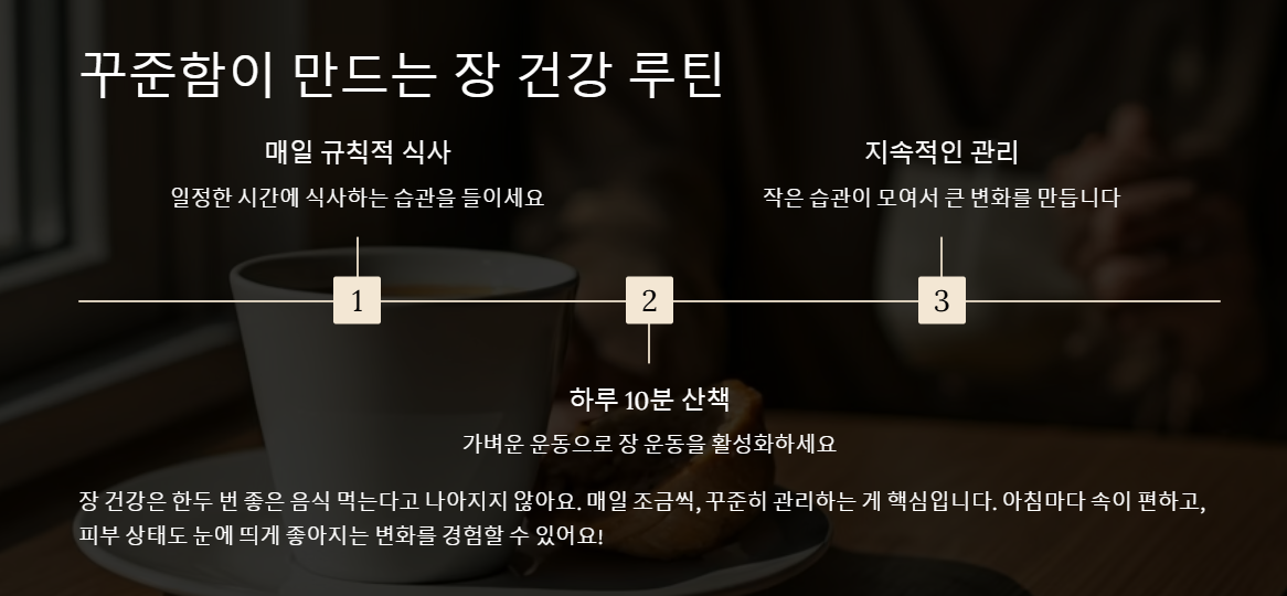 장이 건강해지면 정말 삶의 질이 달라져요. 저는 아침마다 화장실 스트레스 없이 하루를 시작할 수 있게 되니까, 하루가 훨씬 가벼워졌어요.