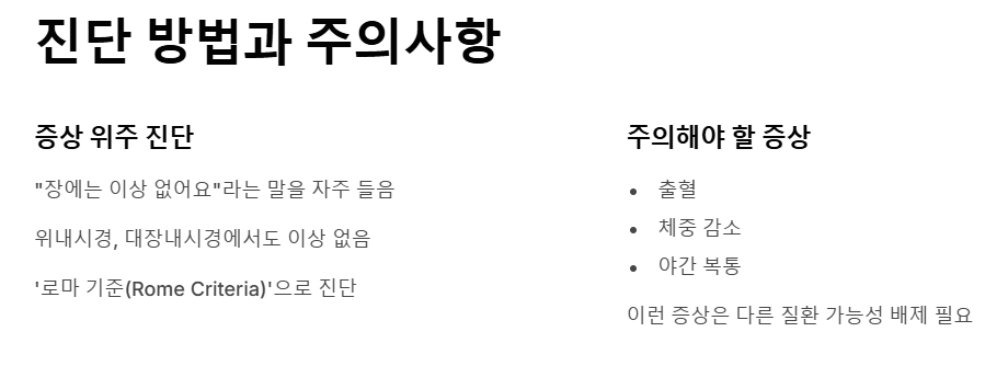 과민성 대장증후군은 특별한 검사를 통해 확인되는 게 아니라, 증상 위주로 진단돼요. 그래서 병원에 가도 “장에는 이상 없어요”라는 말을 듣기 일쑤죠. 저는 위내시경, 대장내시경까지 받았지만 결국 “과민성”이라는 말로 돌아왔어요. 진단은 보통 '로마 기준(Rome Criteria)'을 통해 이루어지며, 만약 출혈, 체중 감소, 야간 복통 등이 있다면 다른 질환 가능성도 반드시 배제해야 해요.