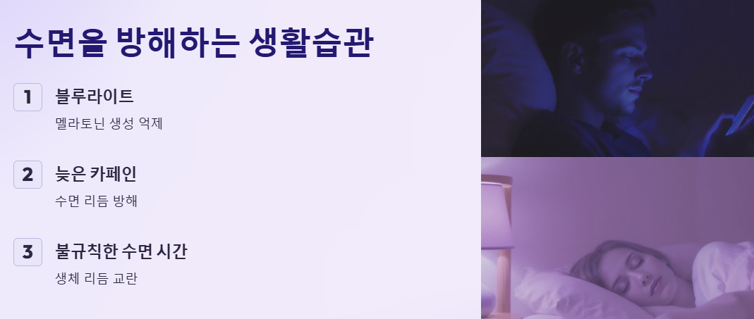 의외로 사소한 습관 하나하나가 수면을 방해할 수 있어요. 저는 예전에 자기 전 TV를 틀어놓는 버릇이 있었는데, 그게 수면에 엄청난 방해가 되더라고요. 밝은 조명, 스마트폰 블루라이트, 늦은 저녁식사, 카페인 음료 섭취 등은 모두 숙면을 막는 적입니다. 특히 블루라이트는 멜라토닌 생성을 억제해서 자연스러운 수면 리듬을 망쳐요. 밤에는 되도록 조명을 낮추고, 핸드폰 대신 책을 읽는 습관을 들여보세요 📚