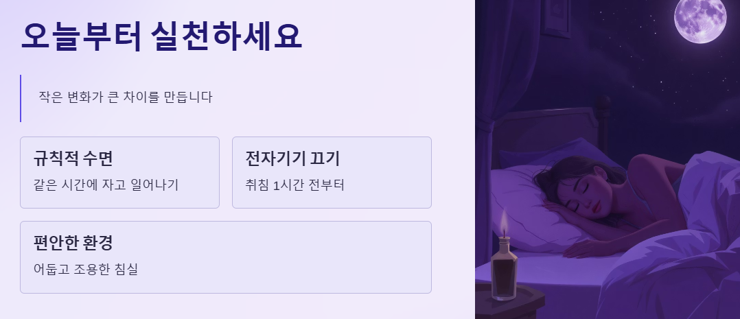 가장 쉬운 변화부터 시작해보세요. 오늘 저녁, 스마트폰은 자기 1시간 전에 꺼두고, 따뜻한 허브티 한 잔과 함께 조용한 시간을 가져보는 건 어떨까요? 갑자기 모든 걸 바꾸기보단, 하나씩 차근차근 실천하는 게 더 중요하더라고요. 여러분도 오늘 밤부터 숙면을 위한 작은 루틴을 하나씩 만들어보세요. 그 변화는 생각보다 크답니다! 🌙