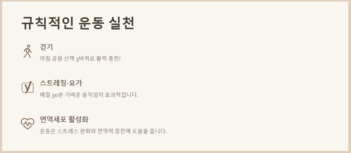 무리한 운동보다는 걷기, 스트레칭, 요가처럼 매일 30분씩 가볍게 움직이는 습관이 훨씬 효과적이더라고요. 저는 아침에 집 앞 공원을 3바퀴 도는 걸로 하루를 시작하는데, 덕분에 기분도 상쾌하고 하루 종일 활력이 넘쳐요! 특히 운동은 스트레스를 줄이고, 면역세포 활성화를 돕는다고 하니 일석이조죠.