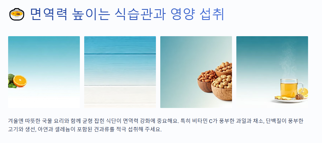 겨울엔 따뜻한 국물 요리와 함께 균형 잡힌 식단이 면역력 강화에 중요해요. 특히 비타민 C가 풍부한 과일과 채소, 단백질이 풍부한 고기와 생선, 아연과 셀레늄이 포함된 견과류를 적극 섭취해 주세요. 생강차, 유자차 같은 따뜻한 차 한 잔도 감기 예방에 탁월하답니다. 저는 개인적으로 유자차에 꿀을 살짝 타서 마시면 감기 걱정도 덜고 몸도 한결 따뜻해지더라고요 😊