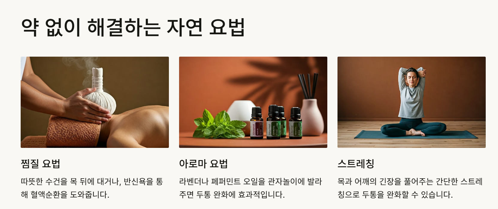 가장 먼저 추천드리는 건 '찜질'. 따뜻한 수건을 목 뒤에 대거나, 반신욕을 통해 혈액순환을 도와주면 훨씬 좋아집니다.