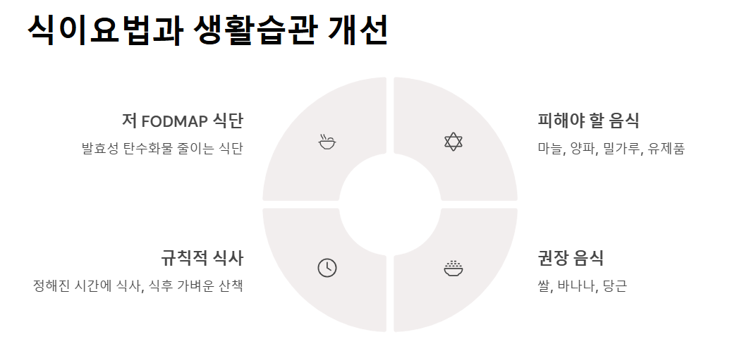 밀가루, 유제품, 카페인, 마늘, 양파, 고추 등은 증상을 유발할 수 있어요. 저 FODMAP 식단을 참고하면 좋아요.