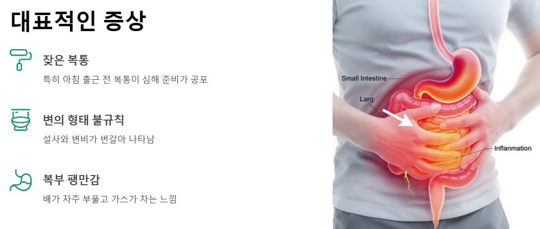 가장 흔한 증상은 잦은 복통과 배변 후의 불완전감이에요. 저는 특히 아침 출근 전에 복통이 심해서 출근 준비 자체가 공포였답니다. 변의 형태도 일정하지 않고, 설사와 변비가 번갈아 나타나는 경우도 많죠. 또 하나 특징은 배가 자주 부풀고, 가스가 차는 느낌이 든다는 점이에요. 이런 증상들이 지속되면 정신적으로도 큰 스트레스를 받게 돼요.